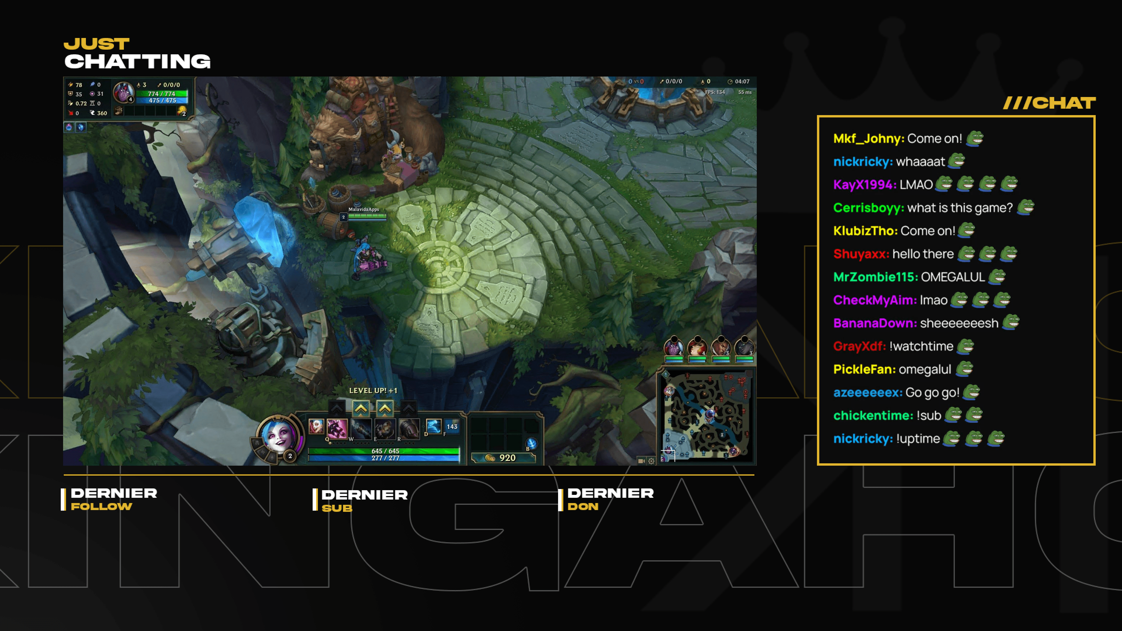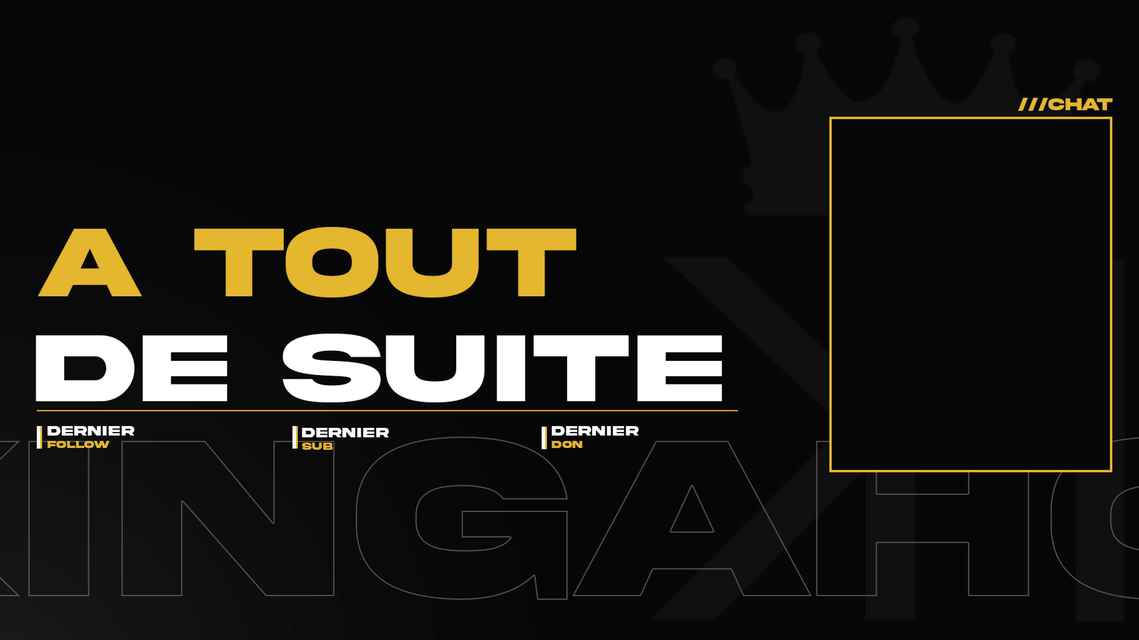 Une fois le concept principal approuvé, j'ai affiné les détails et développé les éléments graphiques supplémentaires, tels que les overlays et les animations, en m'assurant qu'ils étaient à la fois esthétiques et fonctionnels pour améliorer l'expérience visuelle de son contenu gaming. Enfin, j'ai présenté à Kingahot une charte graphique complète et cohérente, prête à être déployée sur toutes ses plateformes de contenu (twitch, Twitter, YouTube).